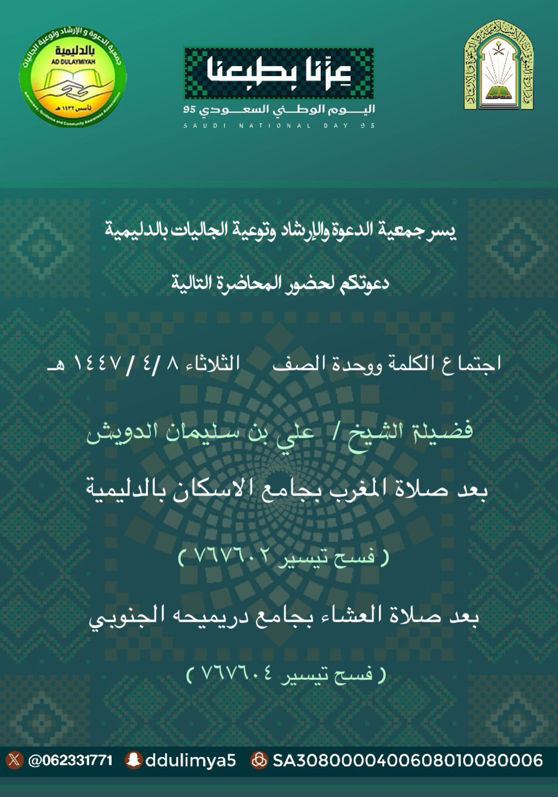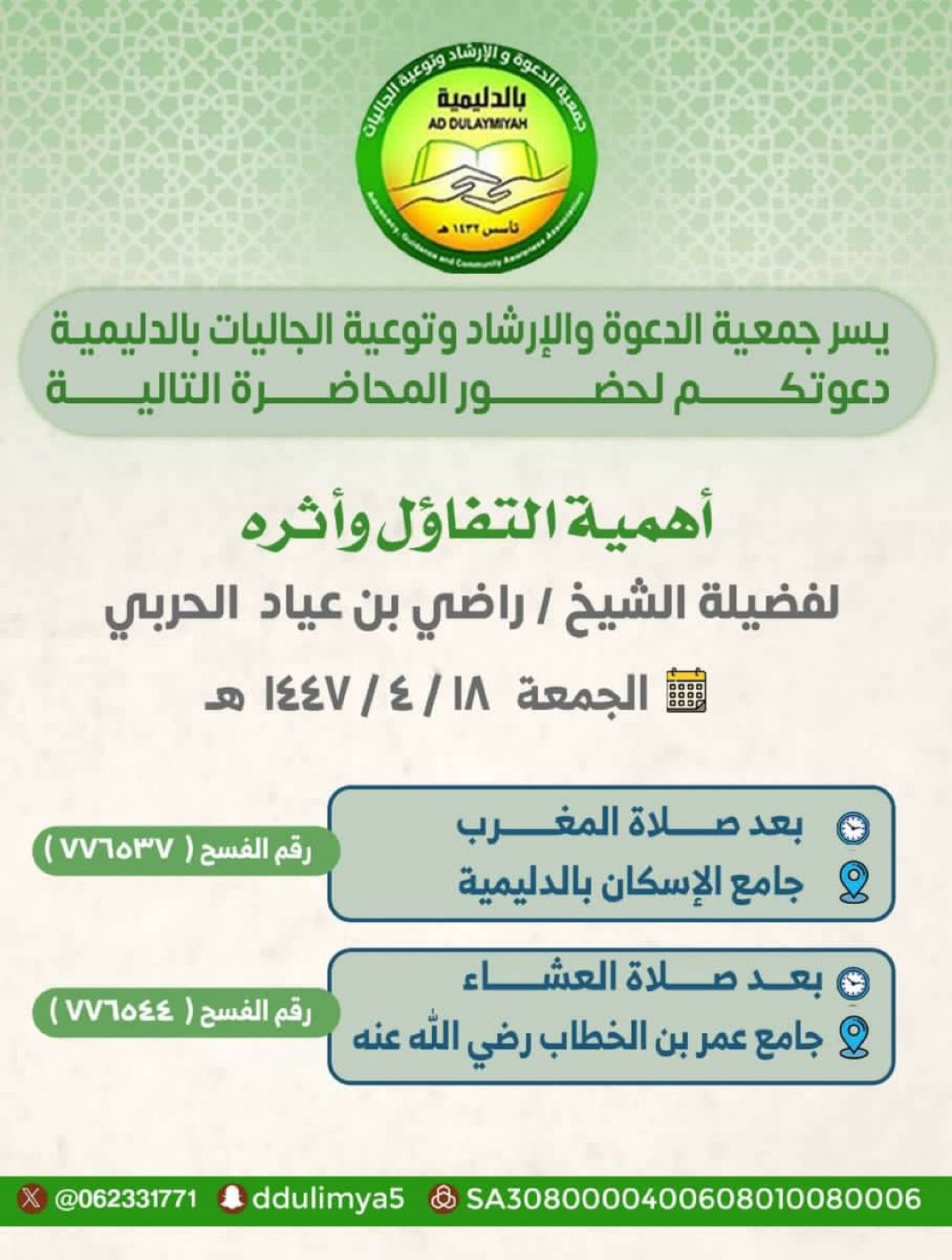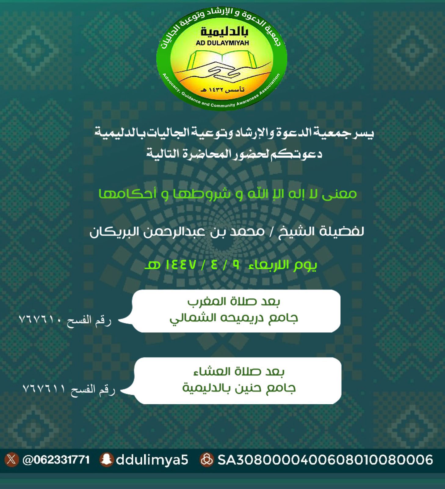 مؤسسة خيرية تعني بالدعوة والإرشاد وتوعية الجاليات بمركز الدليمية بإشراف فني من وزارة الشؤون الإسلامية والدعوة والإرشاد وإشراف تنظيمي من المركز الوطني لتنمية القطاع الغير ربحي افتتحت عام ١٤٣٢ هـ .
